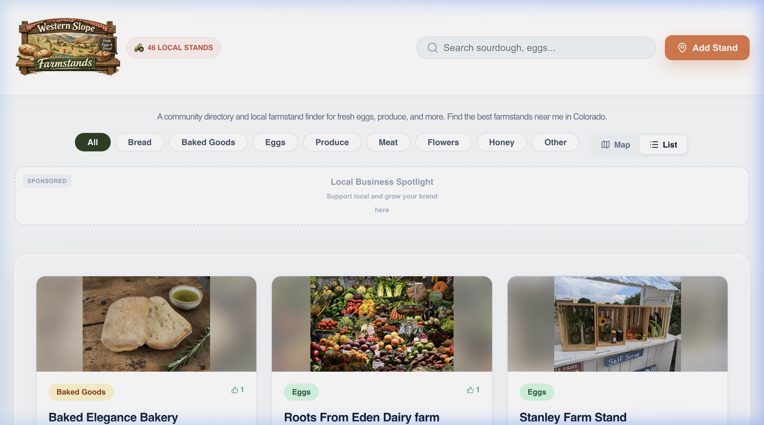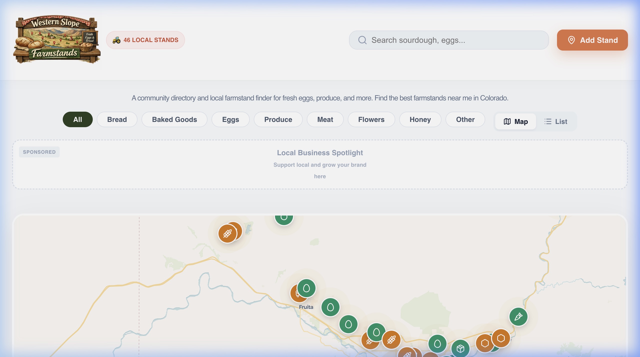 Each farmstand gets its own dedicated profile page with rich metadata, OpenGraph sharing tags, and JSON-LD structured data so Google can surface the right stand for searches like "fresh eggs near Fruita" or "sourdough farmstand Grand Junction." The map updates in real time as the community adds new stands.